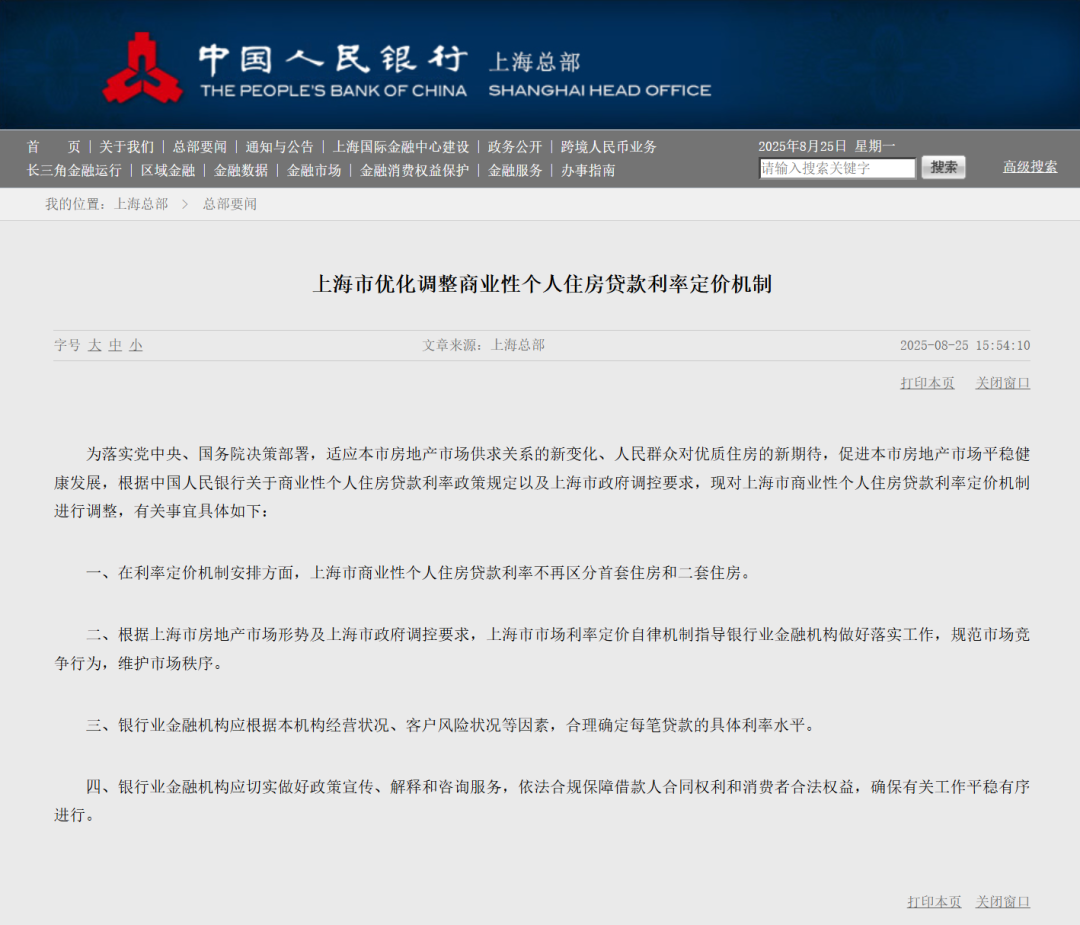 8月25日,央行上海总部发布示知称,把柄中国东说念主民银行对于交易性个东说念主住房贷款利率战术法例以及上海市政府调控条目,对上海市交易性个东说念主住房贷款利率订价机制进行辗转。