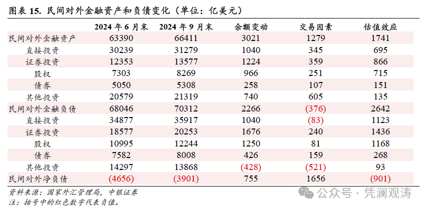 从三季度情况看,民间对外净欠债边界减少755亿好意思元。其中,来回要素导致对外金融钞票增多1279亿好意思元、对外金融欠债减少376亿好意思元,汇率和钞票价钱变化则永别导致对外金融钞票和欠债增多了1741亿和2642亿好意思元(当季东谈主民币汇率中间价反弹1.7%,带来欠债限定估值效应约为840亿好意思元【2】),对外证券投资和外来证券投资的正估值效应较为赫然,其中又以股权投资的正估值效应为主,永别为715亿和1168亿好意思元,主要反应了三季度国表里股市高潮的影响(见图表15)。