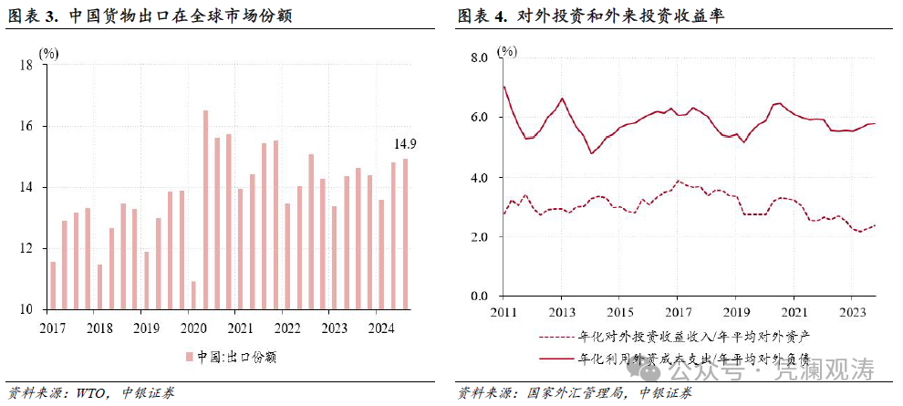 当季,货品买卖顺差同比增长47%至2299亿好意思元,刷新单季历史纪录,孝敬了无为格式顺差同比增幅的85%(见图表2)。同期,海关隘径的货品买卖顺差同比增长16%至2579亿好意思元,创历史新高,其中出口商品“量升价跌”气候延续,出口数目和(东谈主民币计价的)价钱同比增速均值永别为12.3%、-6.0%,反应了外需回仁爱中国产业竞争力进步的影响。当季,中国货品出口在群众市集份额同比上升0.3个百分点至14.9%,为2022年四季度以来新高(见图表3)。