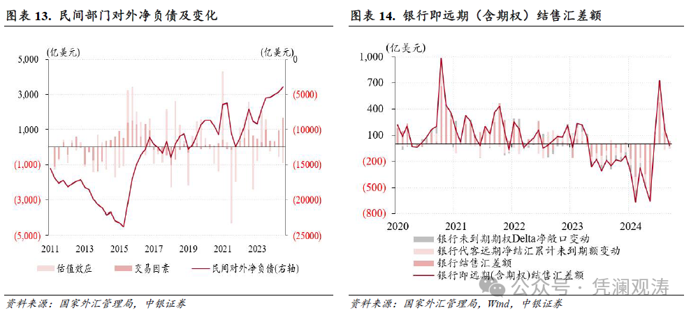 2024年9月末,民间对外净欠债3901亿好意思元,占GDP比重为2.1%,二者均延续了2023年二季度以来下落态势,较2023年3月末永别减少5261亿好意思元、回落3.1个百分点。本事,民间对外净欠债边界降幅中,来回引起的变化是4549亿好意思元(来回要素导致对外金融钞票和欠债永别增多4960亿、411亿好意思元),孝敬率为86%,估值效应仅孝敬了14%(见图表13)。民间货币错配景况显贵改善是2023年7月以来境表里汇在较永劫辰内处于供不应求状态,但外汇市集仍然保握恰当动手的伏击保险(见图表14)。
