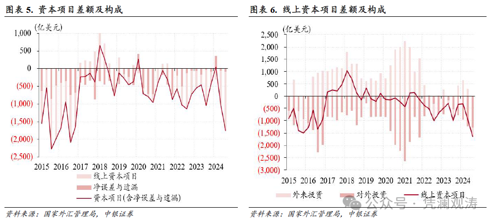 三季度,老本格式(含净缝隙与遗漏)逆差1750亿好意思元,同比增长69%,为2016年四季度以来新高,线上老本格式逆差同比增长66%至1656亿好意思元,创历史新高,其中民间部门对外投资(内资)和外来投资(外资)同期出现净流出:对外投资净流出(非储备性质金融账户钞票端净额)为1279亿好意思元,延续了2023年三季度以来升势;外来投资(即金融账户欠债端净额)由此前三个季度勾通净流入转为净流出376亿好意思元(见图表5、6)。