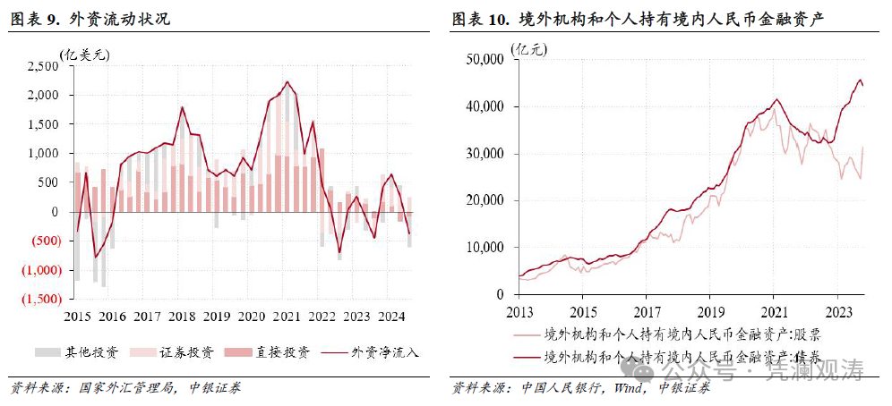东谈主民银行数据涌现,三季度,境外机构和个东谈主握有的境内股票余额增多了4309亿元,增多额历史名次第四,同期外资握有的境内东谈主民币债券余额增多了778亿元,增多额为近四个季度以来新低,主如若因为9月底国内出台的一揽子战略有劲提振了市集信心,外资设立标的由债券转向股票:9月份,外资握有股票钞票余额新增6576亿元,但净减握债券钞票1311亿元,二者均创历史新高(见图表10)。